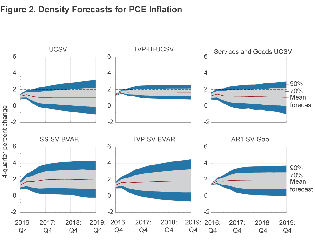 Each of these six models is estimated using data through 2016:Q3 and then simulated to obtain thousands of forecast paths up to 13 quarters out in order to match the SEP projection horizon (i.e., from 2016:Q4 to 2019:Q4).11 The mean of these thousands of forecast paths is denoted as the point forecast; it reflects the most likely forecast of future inflation generated by a given model.12