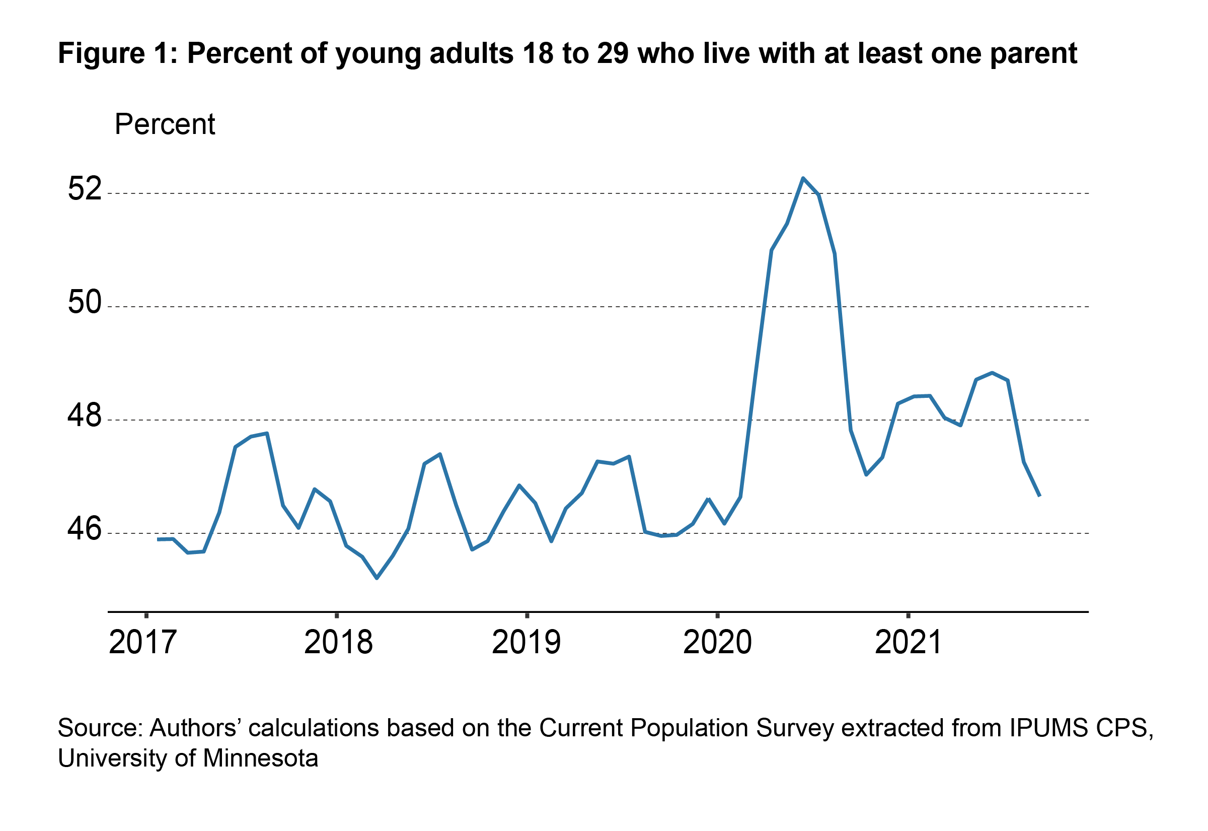 Figure 1 notes that the share of 18- to 29-year-olds in the United States living with at least one parent1 rose sharply in March 2020 at the onset of the pandemic and related lockdowns.2 This share reached its peak a few months later in June 2020 before decreasing quickly in September 2020 at or near the start of the academic year, stopping at a level close to the recent prepandemic peak in August 2018. From November 2020 through July 2021, the percent of young adults living with at least one parent stayed at historically high levels until these levels began to decrease in August 2021, returning to prepandemic levels in September 2021. While the series has a seasonal component that coincides with the academic year, the increase in 2020 is notably larger than any previous upticks in the data. The jump of around 6 percentage points of young adults living with at least one parent suggests a strong effect of the most recent crisis on this population.