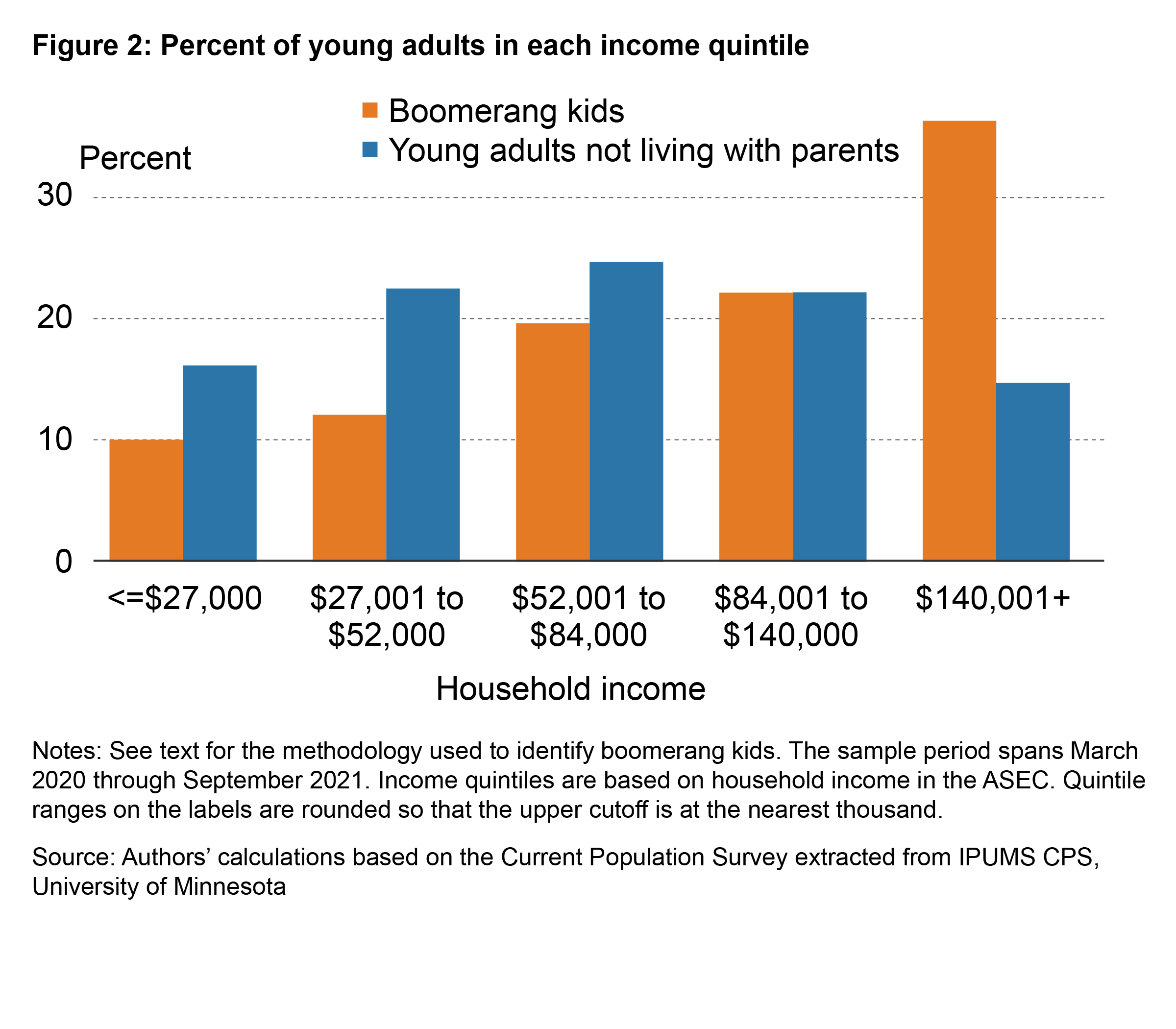 | Young adults not living with parents | All boomerang kids | Boomerang kids in the lowest income quintile | Boomerang kids in the highest income quintile | |