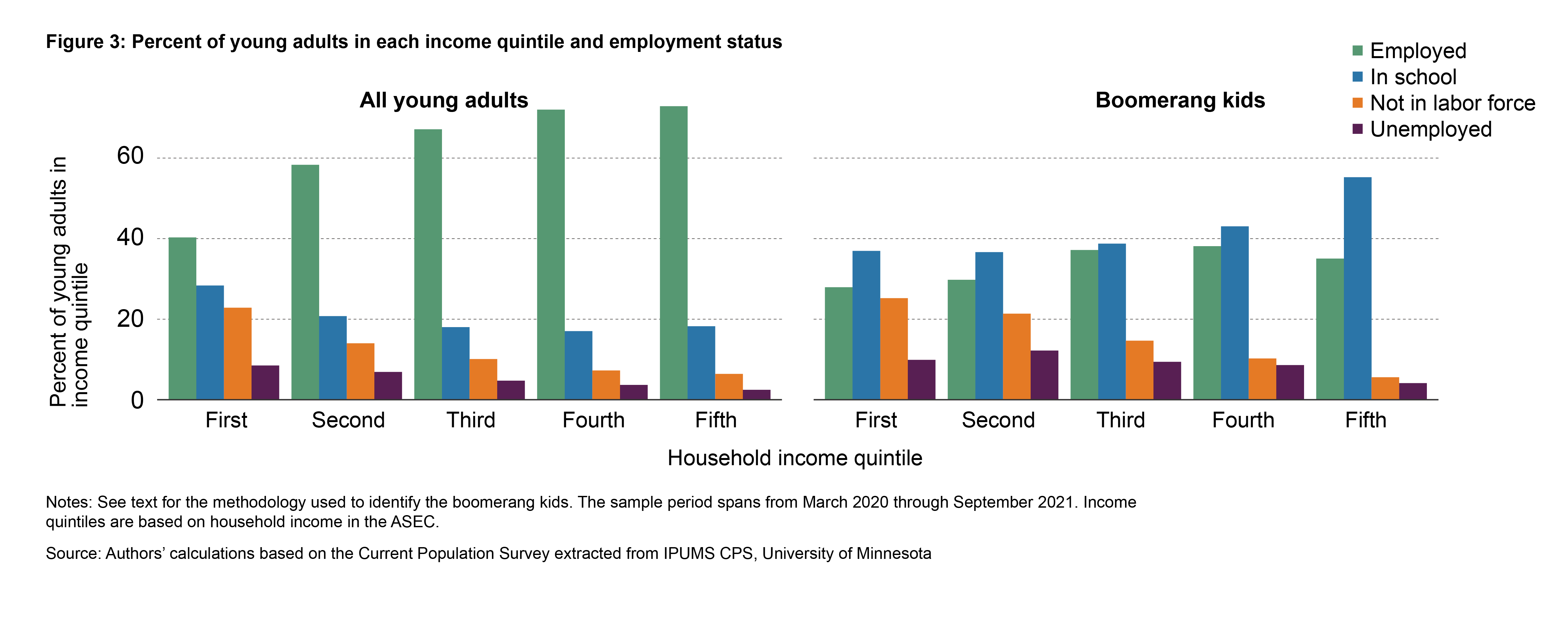 After identifying the boomerang kids in the pandemic, we can proceed to examine the differences between boomerang kids and young adults not living with their parents to pin-down the key aspects that make returning home a possibility for some young adults but not others. We will focus on income distribution, family composition, and attachment to the labor force within this boomerang group. We conduct our analysis for the period spanning March 2020 through September 2021, and to determine household income for young adults, we link our sample data to the Annual Social and Economic Supplement (ASEC) of the CPS.