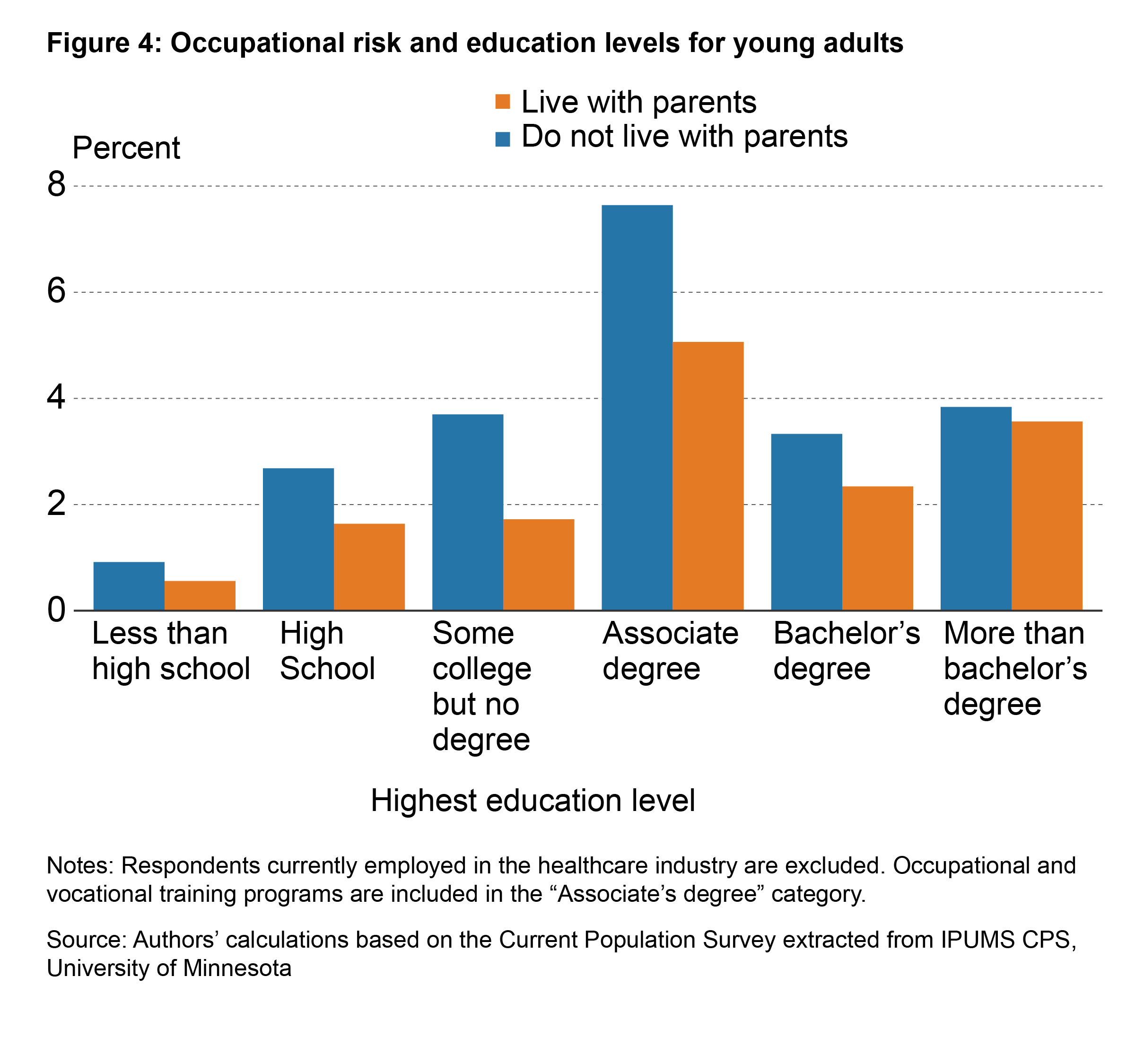 While we have already shown that young adults living at home are less likely to work in high-risk occupations, we must consider the possibility that differences in education levels between young adults living with and without their parents could affect the occupations they work in and therefore the average occupational risk levels. To separate the effects of education from the effects of living with parents on occupational risk, we show the percent of employed young adults working in a high-risk occupation by education level and living arrangement. In Figure 4 we can observe that young adults living with their parents are less likely to work in a high-risk occupation at every education level when compared to young adults not living with their parents.12 This suggests that the difference in average occupational risk cannot be solely attributed to differences in education levels. Young adults living with parents and who have a degree or certification beyond a high school diploma are more likely to work in high-risk occupations compared to those with lower levels of educations. The high-risk occupations they work in tend to require a specific degree or certification, including those who work as counselors, firefighters, morticians, and flight attendants. These young adults may be less likely to switch occupations since they have invested in obtaining the education or certification required to work in these specific occupations.