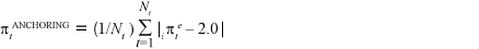 Looking beyond the 2012:Q1 survey round, one eventually sees evidence of a change in the behavior of this measure of inflation expectations. In particular, there is a stronger anchoring of inflation expectations around the 2 percent inflation objective. To gain a better appreciation of the timing and extent of the anchoring, we adopt the following measure of anchoring that calculates the average absolute distance of the individual forecasts from the 2 percent objective:
