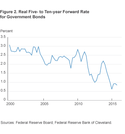 Another way of estimating the natural interest rate is to calculate what markets expect the real short-term interest rate to be on average between five and ten years from now. We use five- and ten-year government bonds to estimate the nominal short-term interest rate in the future, and then we adjust this rate for expected inflation using estimates from a model developed by the Federal Reserve Bank of Cleveland to get the natural rate. This calculation also suggests the natural rate has declined (figure 2). Prior to 2012 this measure of the natural rate averaged more than 2 percent. Recently, however, it has averaged less than 1.5 percent. The decline is nearly basis points.