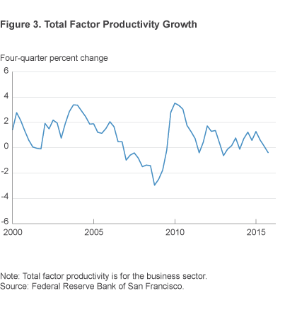 A final indication that the natural interest rate has fallen comes from recent data on productivity growth. Productivity growth is one of the most important determinants of the natural rate, and the data suggest it has declined since the last recession. High productivity growth increases the return on capital investment, leading to a greater demand for investment funds and upward pressure on real interest rates. Lower productivity growth depresses the return to capital and the natural interest rate, all else equal. Before the recession, productivity growth averaged 1.4 percent, but since the start of the recession, it has averaged only 0.4 percent—a full percentage point decline (figure 3).