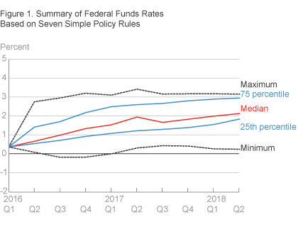 With seven rules, three forecasts, and quarterly data, there are a large number of federal funds rates to share. Figure 1 provides a summary of the results using quartiles. We present the median (50th percentile) federal funds rate across all the policy rules and forecasts, along with the 25th and 75th percentiles and the maximum and minimum funds rate at each point in time. Based on data and forecasts available as of June 23, 2016, the median federal funds rate from the simple policy rules we consider rises from 0.7 percent in 2016:Q2 to 2.1 percent in 2018:Q2.16