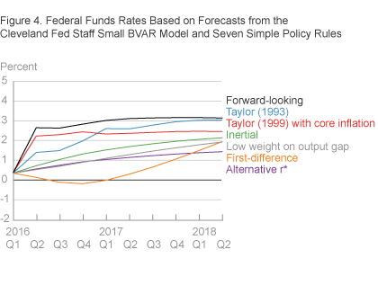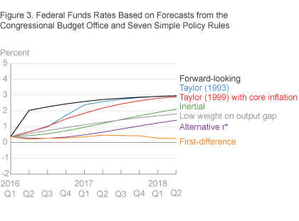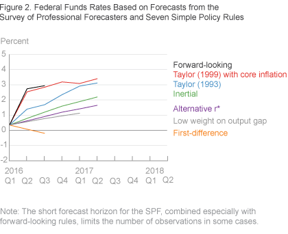 Crucially, in all cases, we take the forecast as given and then calculate the implied average federal funds rate for each quarter based on the seven simple policy rules (see also, e.g., Plosser 2014). That is, we do not model the manner in which different paths for the federal funds rate would affect the forecast—even though theory and empirical evidence suggest that higher paths for the federal funds rate would tend to slow economic activity and inflation, while lower paths for the federal funds rate would tend to increase economic activity and inflation.15