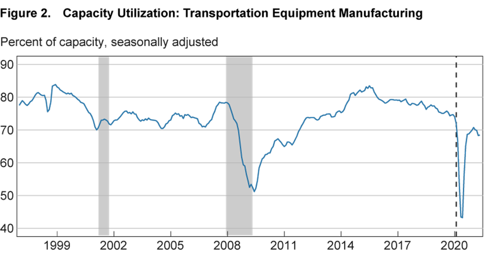 Notes: The figure depicts the three-month moving average of FRB capacity utilization in the transportation equipment manufacturing industry. Shaded bars indicate NBER recessions. The vertical dashed line denotes the NBER’s most recent peak. Last observation: May 2021. Source: Federal Reserve Board via Haver Analytics.
