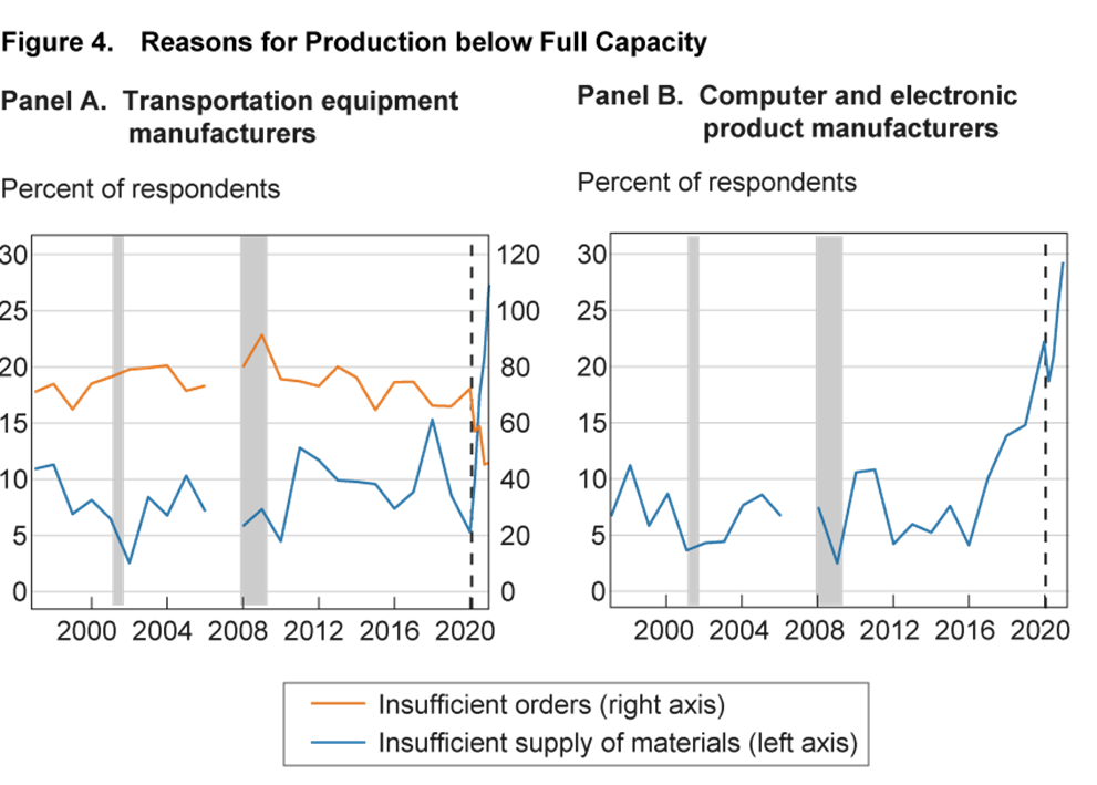 Transportation equipment manufacturers are more likely to cite insufficient materials for reduced production than before the pandemic recession, and this is consistent with the narrative that semiconductor shortages have weighed on production in this industry. The fraction of respondents in the transportation equipment manufacturing industry citing insufficient supply of materials has risen sharply since 2020:Q1 to high levels in 2021:Q1, as shown in figure 4 panel A (blue line). In 2021:Q1, 27, 3 percent of respondents cited this reason for producing below full capacity, which is well above any level since the start of the data in 1997.5