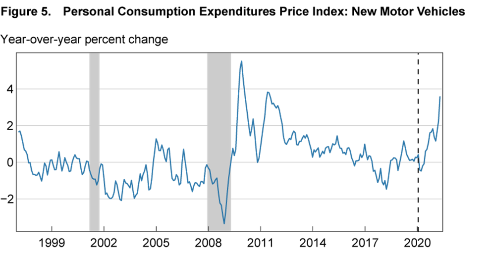 - Annualized 24-month changes in the new car PCE index, a measure that avoids base effects, also suggest a recent acceleration in new car prices—from 0.3 percent in April 2020 to 1.7 percent in May 2021—but only to levels observed in 2013. Return to 8