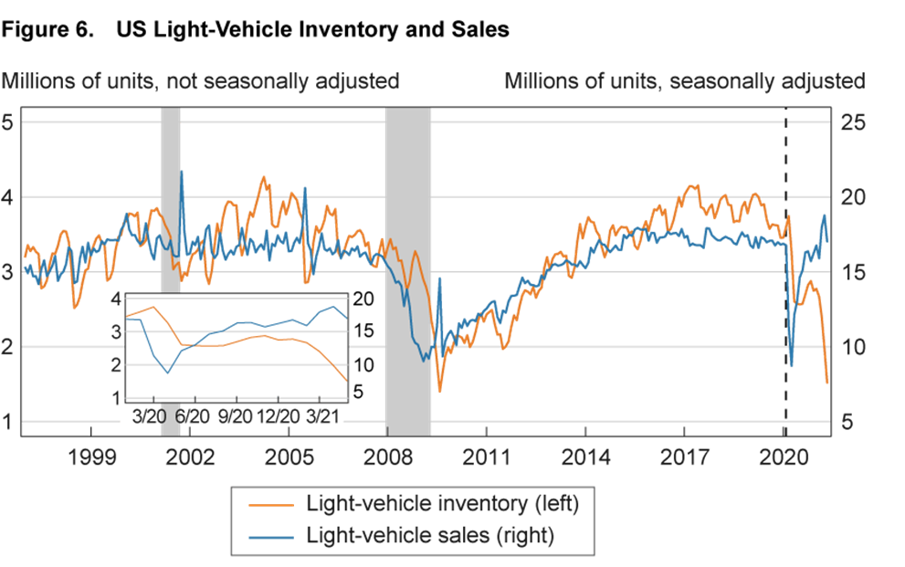 Notes: The figure depicts light-vehicle sales at an annualized rate and inventory in the US. Shaded bars indicate NBER recessions. The vertical dashed line denotes the NBER’s most recent peak. Last observation: May 2021. Sources: Ward’s Communication, Bureau of Economic Analysis via Haver Analytics.