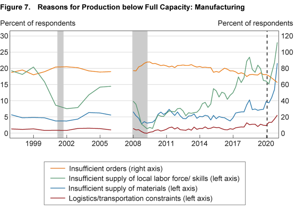 Notes: The figure depicts the fraction of respondents citing insufficient orders, insufficient supply of local labor force/skills, insufficient supply of materials, and logistics/transportation constraints for producing below full capacity production for the manufacturing sector. Data are annual from 1996 until 2006 and quarterly from 2008:Q1 to 2021:Q1. Data for 2007 are not available. Shaded bars indicate NBER recessions. The vertical dashed line denotes the NBER’s most recent peak. Last observation: 2021Q1. Source: Census Bureau via Federal Reserve Board (nonpublic).
