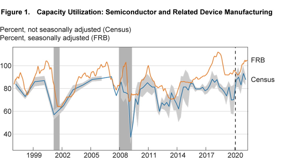 Notes: The figure depicts the capacity utilization rate in the semiconductor and related device manufacturing industry from the FRB and Census. The shaded areas surrounding the blue line represent 95 percent confidence intervals for the Census measure, which are not available from 2007:Q1 to 2007:Q4. Shaded bars indicate National Bureau of Economic Research (NBER) recessions. The vertical dashed line denotes the NBER’s most recent peak. Last observation: 2021:Q1 (Census), April 2021 (FRB). Sources: Census Bureau, Federal Reserve Board (nonpublic).