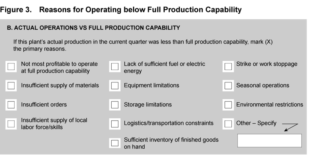 Notes: The figure depicts the section of the Quarterly Survey of Plant Capacity Utilization questionnaire that asks plants to provide the primary reasons for operating at less than full production capability in the current quarter. Source: Census Bureau.