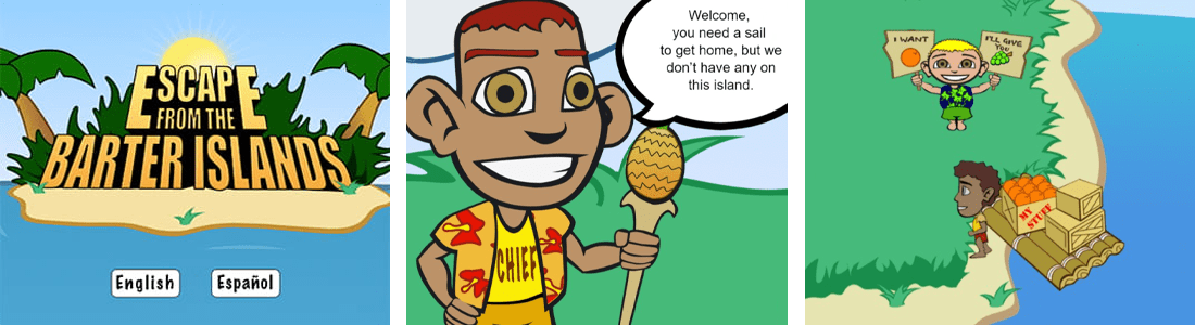 Trade your way to adventure and help shipwrecked Robbie navigate his way through the Barter Islands. Learn about the fundamentals of a barter system and the value of a uniform and acceptable currency. This free resource is available in English and Spanish.