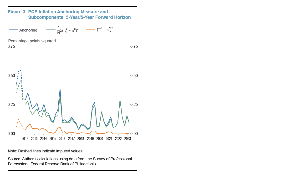 We apply our anchoring measure to professional forecasters’ predictions of PCE inflation since the FOMC’s 2012 announcement of a 2 percent inflation target. We find that the initial effect of the announcement was very limited, though there was a subsequent improvement in the anchoring of both expectations series during the next few years. Our analysis also suggests that, over the period when overall inflation expectations were well-anchored, movements in the extent of expectations’ anchoring are generally driven by changes in forecaster disagreement. When we examine the inflation surge in the post 2020-period, we find that longer-run inflation expectations remained well-anchored. In contrast, there was a dramatic deterioration in the anchoring of medium-run inflation expectations that largely reflected a misalignment between the consensus inflation forecast and the inflation target. This deterioration, however, has largely reversed itself based on the SPF results for the first two quarters of 2023.