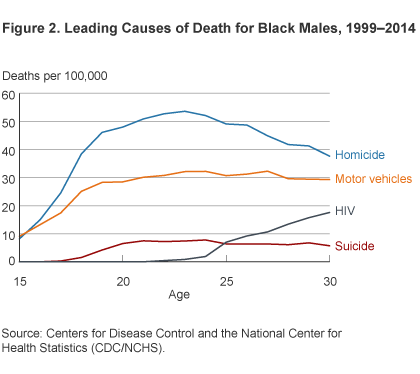 For black males, homicide is the most likely cause of death, and the contrast with white males is remarkable. At age 20, the death rate per 100,000 black males by homicide was 48, while the analogous rate for white males was 6. Given that mortality is driven primarily by homicide for young black males, it suggests that their exposure to violence is much higher than their white counterparts.