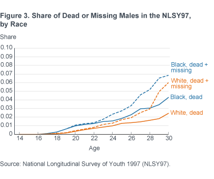 To address this issue, we calculate mortality rates using the NLSY97 data (if a respondent dies between surveys, it is recorded) and compare these rates to the mortality rates from the CDC/NCHS data. We also construct an upper bound on our mortality estimate consisting of the share of respondents known to be deceased combined with the share of respondents who did not respond to the survey because they were missing and never subsequently found. That is, the upper bound shows the response rate on a question if we assume all missing persons are dead. This is not an unreasonable assumption, given that the BLS conducts an exhaustive search for every respondent who fails to report.