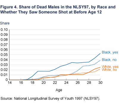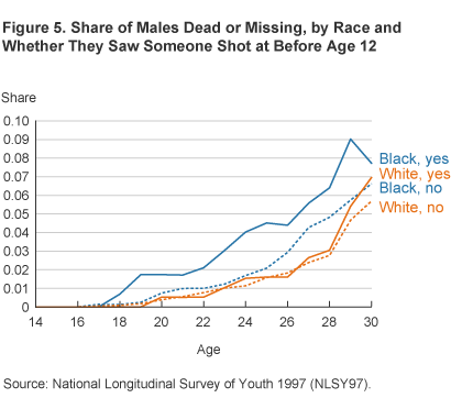 This article has documented that black young males in the United States are exposed to much more violence in early childhood than their white counterparts, as measured both by children’s perceptions and their subsequent mortality in early adulthood. We have also shown that exposure to violence has a strong relationship with a host of undesirable later outcomes, and that this relationship tends to be the same regardless of race, household income, mother’s educational attainment, or family structure.