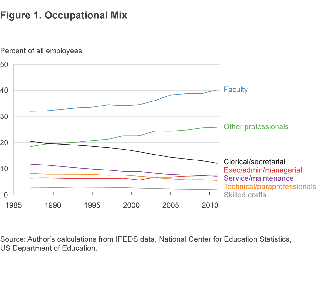 This Economic Commentary explores trends in employment at colleges and universities in the United States between 1987 and 2013. Some of the results from this analysis are in line with conventional wisdom. For example, I document that a declining proportion of faculty are full-time employees. On the other hand, some of the results are counter to popular belief. For example, I find that the share of college employees who are executives, administrators, or managers has not changed appreciably over time.