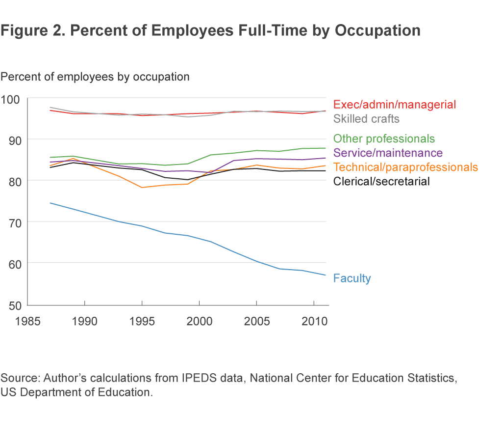 The share of faculty who are full-time employees has indeed fallen over time (figure 2). On the other hand, the shares of employees in the other categories who work full time have not changed appreciably.