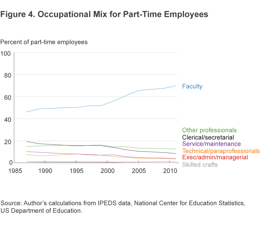 The results of this analysis suggest that the share of employees at colleges who are administrators has not been much higher in recent years than it was in 1987. There has been growth, though, in the other professionals employment category. This growth is potentially related to a growth of amenities and other programs outside of the teaching and research that have been the traditional focus of colleges and universities, although this is difficult to ascertain due to the broad nature of this category. An additional result in the analysis is that the share of faculty who are full-time employees has been declining. This decline has occurred within the public sector, the private sector, and the for-profit sector.