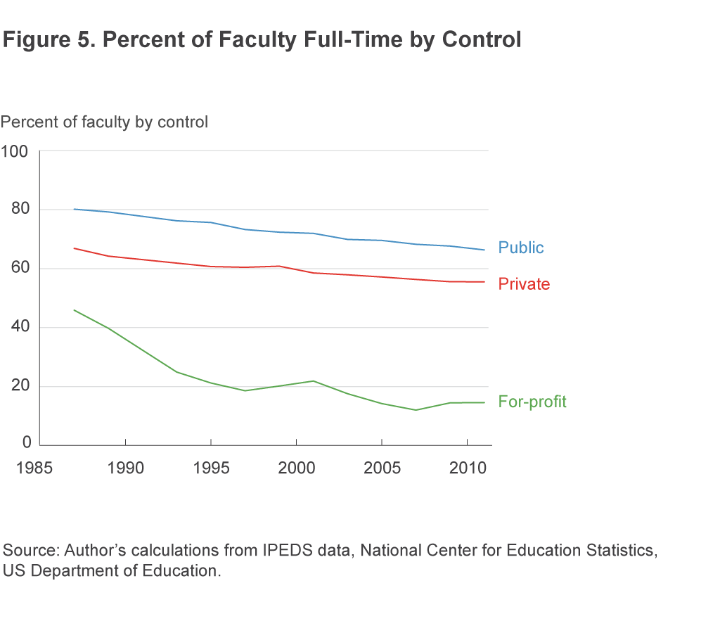 The shares of faculty who are full-time employees differ by institutional control—public, not-for-profit private, and for-profit. The percentage of full-time faculty is higher in the public sector than in the private sector, which is in turn higher than in the for-profit sector (figure 5). Furthermore, the decline in the share of full-time faculty discussed above has occurred in every sector. It is not, for example, solely an artifact of the growing size of the for-profit sector, which employs a higher share of part-time faculty than the other two sectors do.