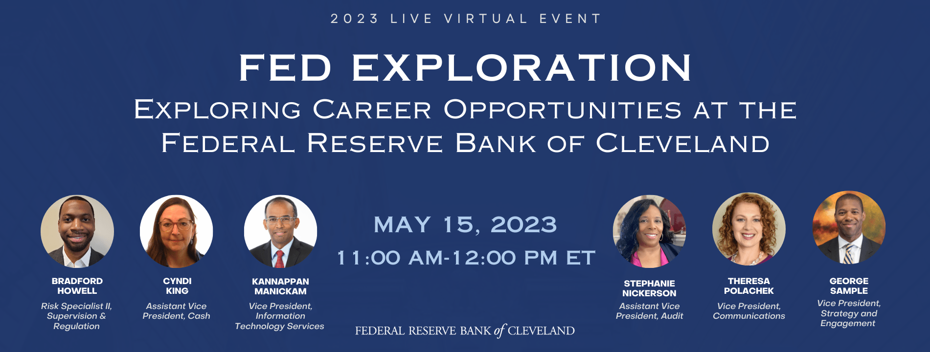 Join the Federal Reserve Bank of Cleveland for a rich discussion with a panel of professionals across multiple departments to hear about the work they do, their career journeys, what it’s like to work at the Bank, and our career opportunities.