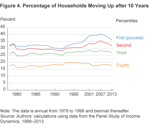 In the analysis above, we have considered only how likely a household is to stay in its current income quintile. Another aspect of mobility that is of interest is how frequently a household moves up to a higher quintile. Figure 4 plots the fraction of households that move up after 10 years, conditional on their current quintile. While there has been a small increase in upward movement for the poorest groups over time, for most income quintiles the fraction is roughly flat.