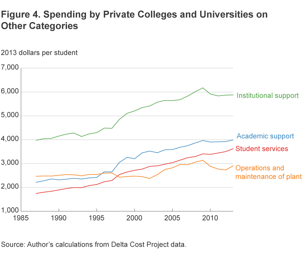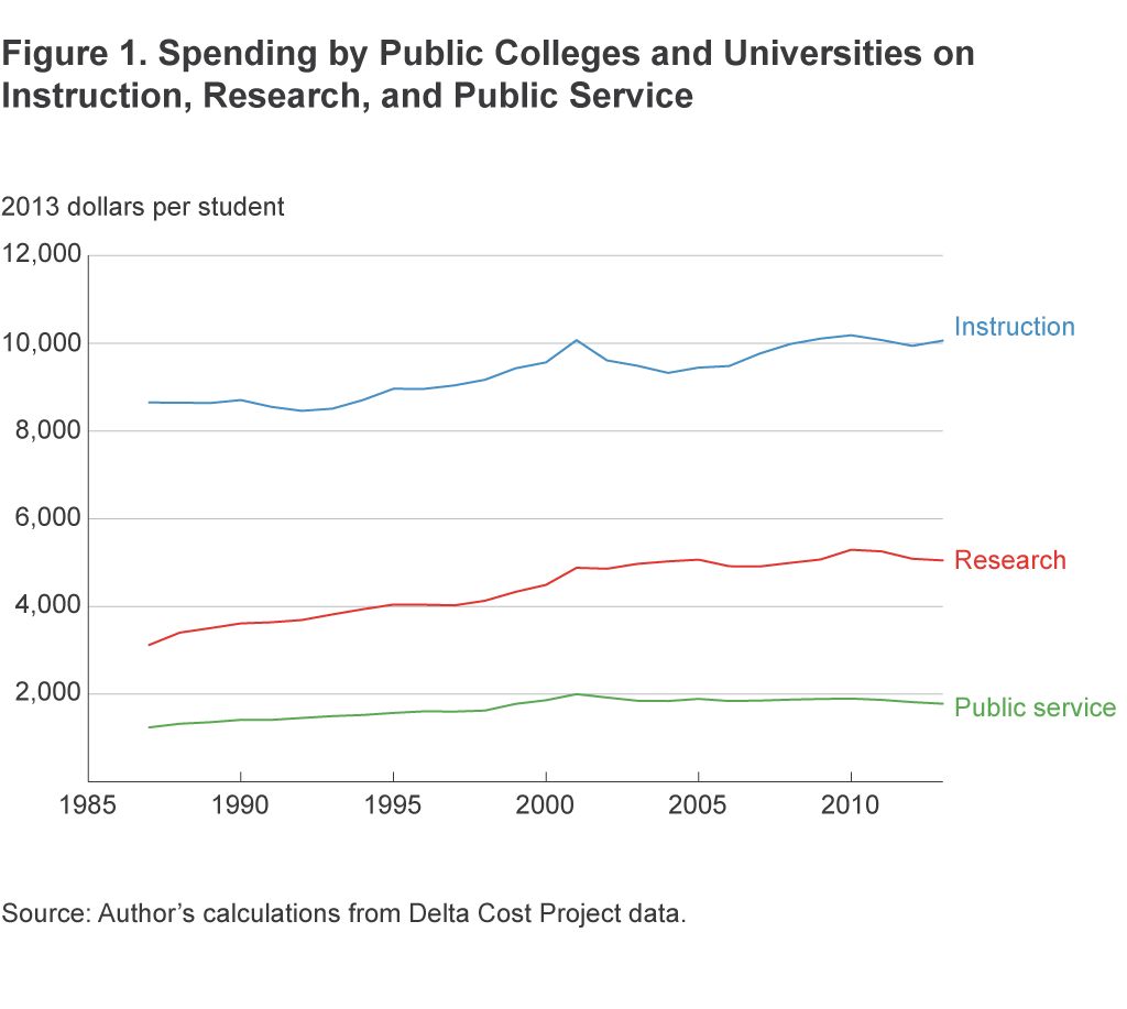 This Economic Commentary studies trends in spending by US colleges and universities in broad expenditure categories between 1987 and 2013. Although this exercise does not provide a complete answer to the question of why the cost of college has been rising, it may help in identifying channels through which the spending increase has occurred. The results reveal that spending per student has risen in most major spending categories. This is true for both public institutions and private institutions. However, spending has risen more dramatically in some categories than others. For example, research is one category that has witnessed among the highest spending growth, and in percentage terms, there has also been a large increase in student services spending.