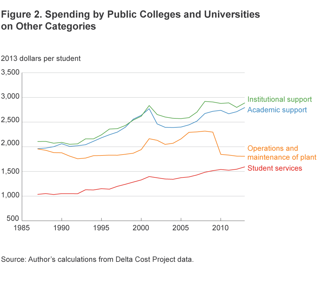 The situation differs for the other categories of spending, as shown in figure 2. Spending in the academic support, institutional support, and operations and maintenance of plant categories has experienced large fluctuations over short periods of time. In particular, spending on all three of these categories dropped by a substantial amount around the time of the 2001 recession, and spending on operations and maintenance of plant dropped dramatically around the time of the more recent recession. But despite some large swings from one year to the next, spending on the categories shown in figure 2—with the exception of operations and maintenance of plant—has risen over time.