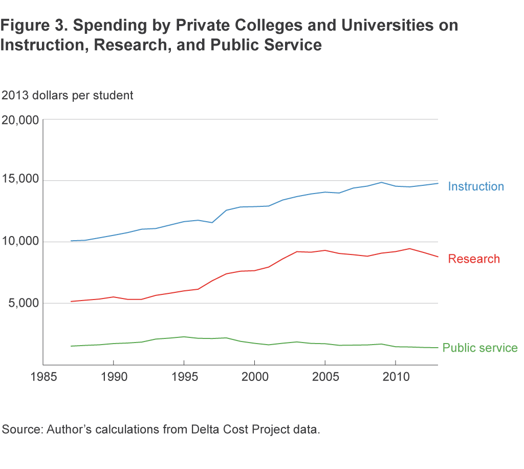 Figure 3 shows instruction, research, and public service spending for private colleges and universities. As with public institutions, spending on instruction and research has increased. However, public service spending at private institutions has actually declined slightly. In every year of the data, private institutions spend more than public institutions on a per-student basis in the categories of instruction and research, but public institutions have spent more on public service in recent years.