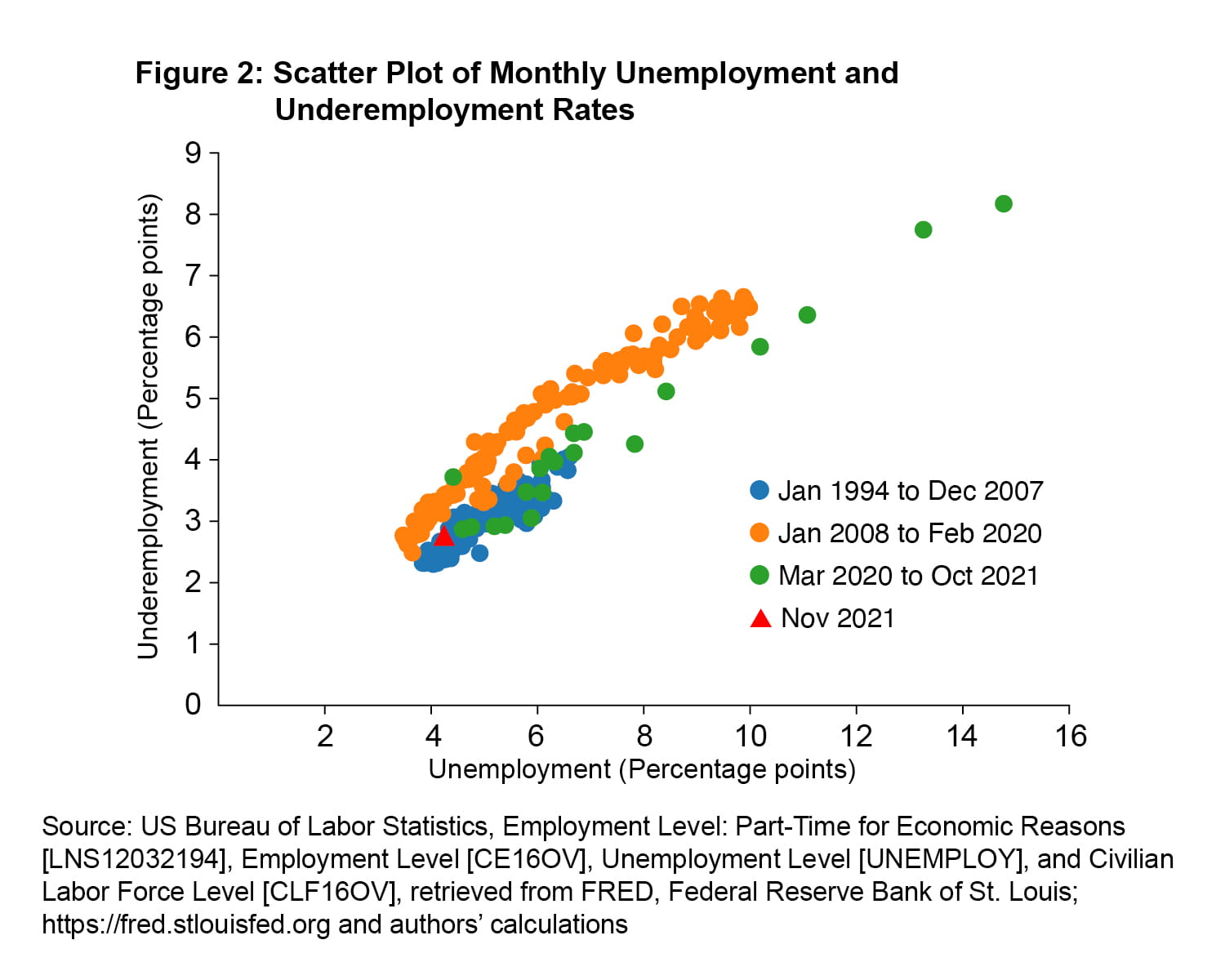 To highlight these features, we also show the monthly unemployment and underemployment rates as a scatter plot in Figure 2 using different colors to represent different time periods. Figure 2 shows an upward shift in the underemployment rate from the January 1994–December 2007 period to the January 2008–February 2020 period, with the collection of orange dots mostly being above the collection of blue dots. This upward shift is another way of seeing that the underemployment rate was persistently elevated compared to the unemployment rate following the Great Recession.8 The March 2020–October 2021 period, shown with green dots, shifts back down and appears more consistent with January 1994–December 2007 than with January 2008–February 2020.9 This downward shift represents the rapid fall in the underemployment rate compared to the unemployment rate after the COVID-19 recession. November 2021 is highlighted with a red triangle and shows that the current underemployment rate is more consistent with levels from January 1994–December 2007 than from January 2008–February 2020.