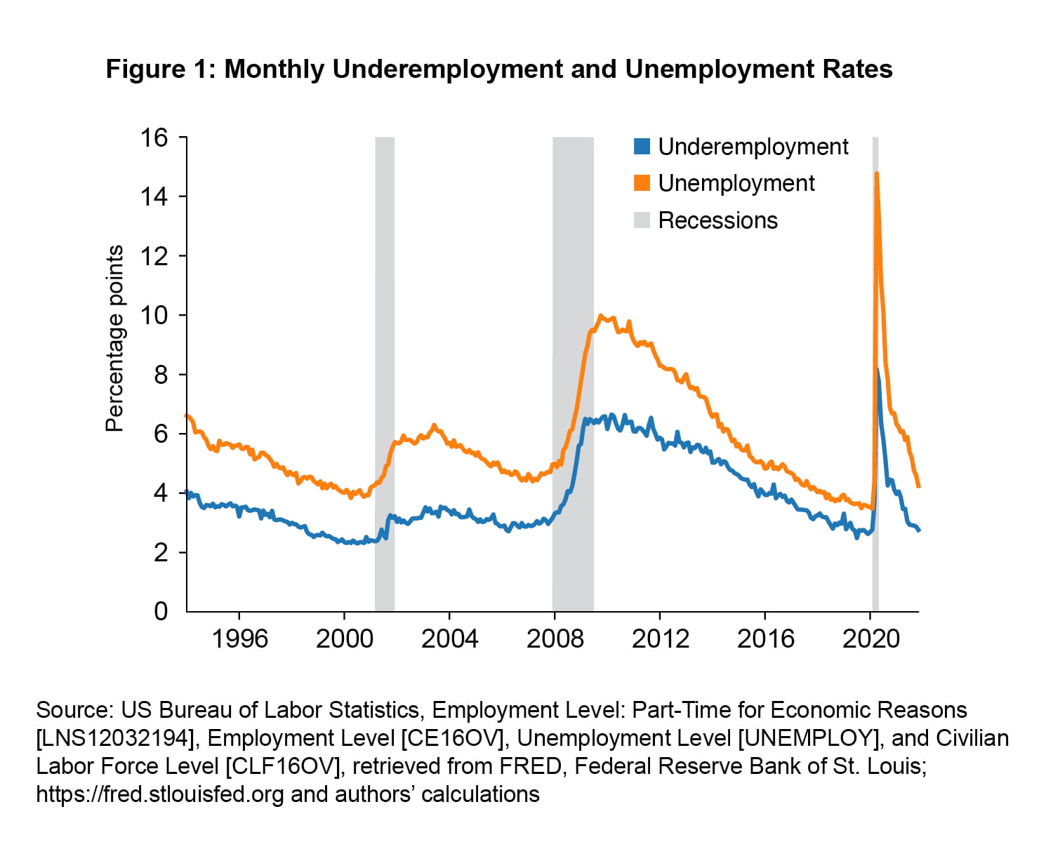 In this Commentary, we study the behavior of US underemployment during recent business cycles. In particular, we focus on the underemployment rate, the percent of employed people who are working part-time but prefer to be working full-time.2 The underemployment rate moves closely with the unemployment rate, rising in recessions and falling in expansions. Consistent with earlier research, we show that the underemployment rate shifted up when compared to the unemployment rate during and following the Great Recession.3 However, we also document a more recent phenomenon, that the underemployment rate has shifted back down after the COVID-19 recession. That is, the unemployment and underemployment rates are now at levels consistent with their pre-2008 behavior.