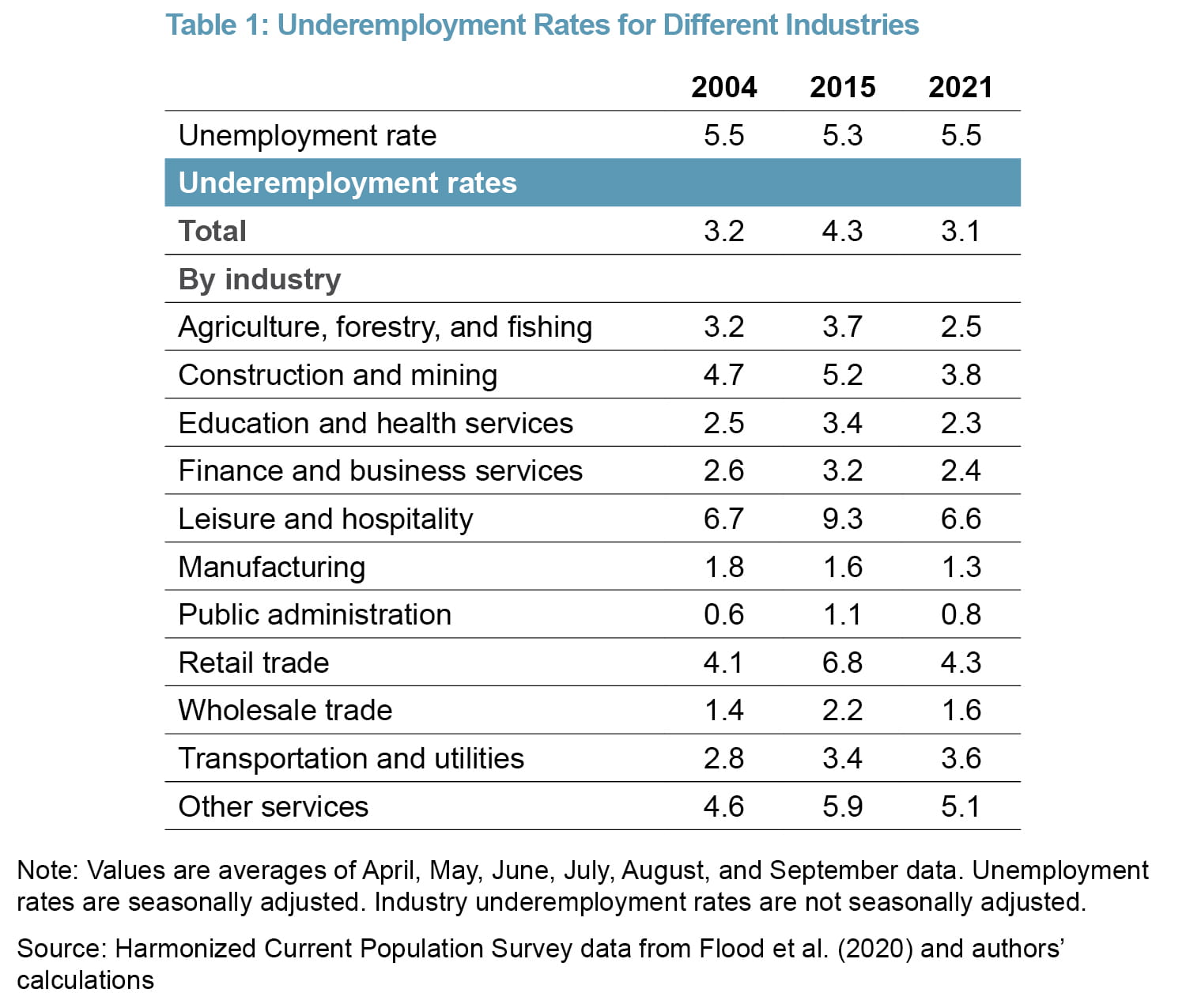 We begin our study of industry structure by showing the underemployment rates across industries at different points in time in Table 1.10 Table 1 also shows the total unemployment and underemployment rates. We use averages of Q2 and Q3 data for 2004, 2015, and 2021 in Table 1 for three reasons. First, the total unemployment rate is similar in each of these periods, allowing us to essentially hold it constant when comparing underemployment rates. Second, using the same quarters in each of these years minimizes the effects of seasonality for our underemployment rates, which are not seasonally adjusted for the industries. Third, averaging over multiple quarters can smooth through noise in the monthly survey data.