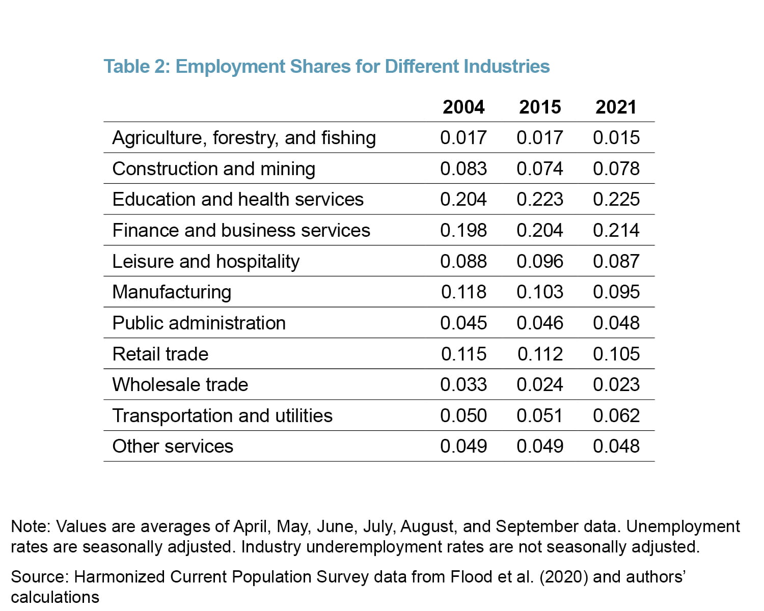 Next, we show employment shares, or the fraction of total employees working within a particular industry, in Table 2 for the same time periods as shown in Table 1. We highlight two results from Table 2. First, there is substantial variation in employment share across industry. For example, education and health services is between 6 and 10 times as large as wholesale trade depending on the time period. Second, employment shares of a given industry can change over time. In particular, the employment share of leisure and hospitality (a high-underemployment rate industry) rose from 2004 to 2015, while the employment share of manufacturing (a low-underemployment rate industry) fell from 2004 to 2015. Also, the employment shares of both leisure and hospitality and retail trade (high-underemployment rate industries) are lower in 2021 than in 2015.