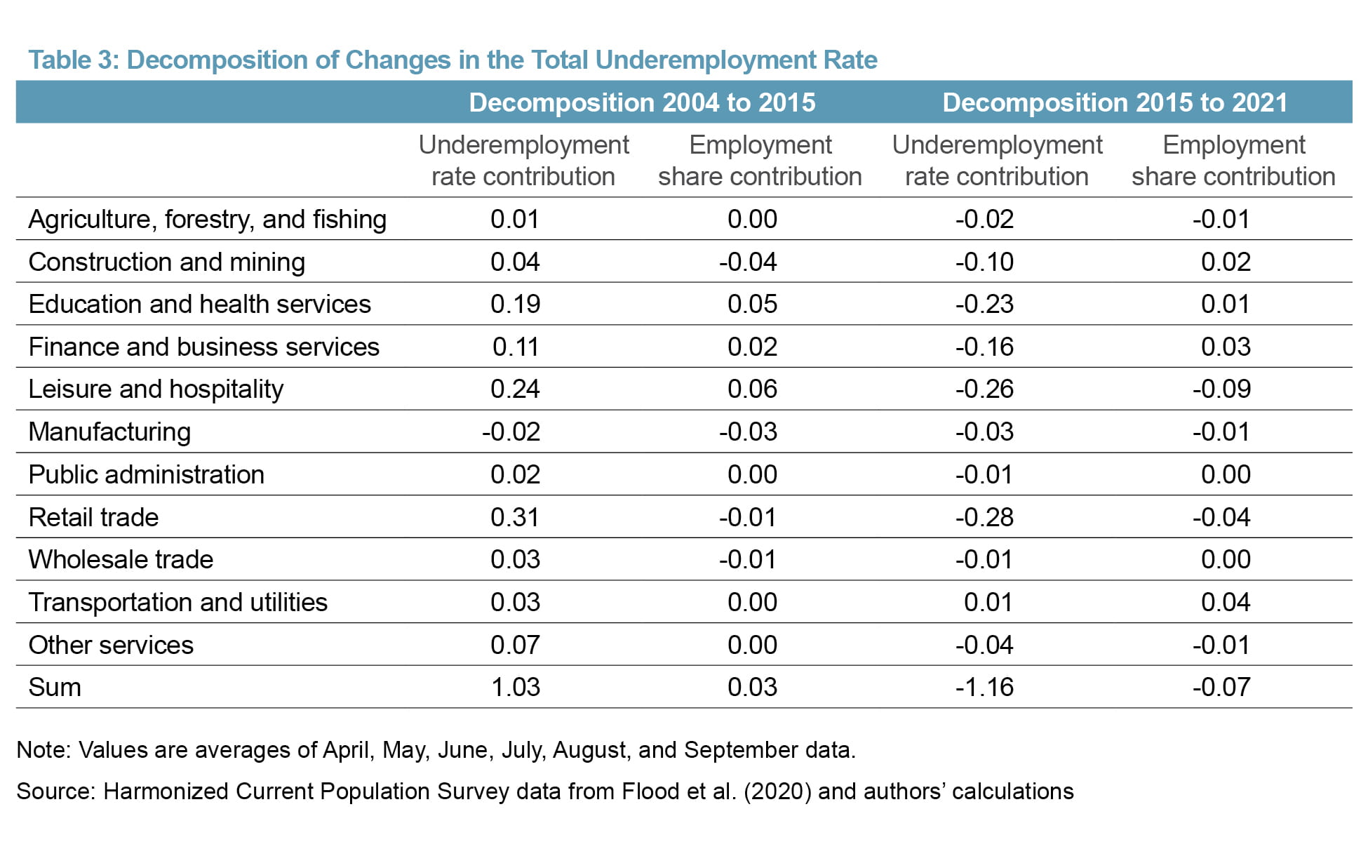 Table 3 shows the results of the decomposition of the change in the underemployment rate from 2004 to 2015 and from 2015 to 2021. For each decomposition, Table 3 has a column for the underemployment rate contribution and for the employment share contribution. The sums in Table 3 show that the underemployment rate contributions account for the vast majority of the 1.1 percentage point underemployment rate increase from 2004 to 2015 and 1.2 percentage point drop in the underemployment rate from 2015 to 2021. While the employment share contribution is positive from 2004 to 2015 and negative from 2015 to 2021, the magnitudes are small: less than 0.1 percentage point in both cases. In other words, changes in industry composition account for essentially none of the change in the total underemployment rate from 2004 to 2015 or from 2015 to 2021. Because of this finding, we do not expect the underemployment rate to revert back to its levels following the Great Recession if industry-specific employment shares revert back to the 2015 levels shown in Table 2.