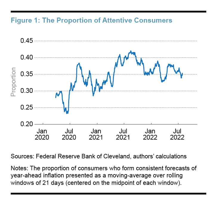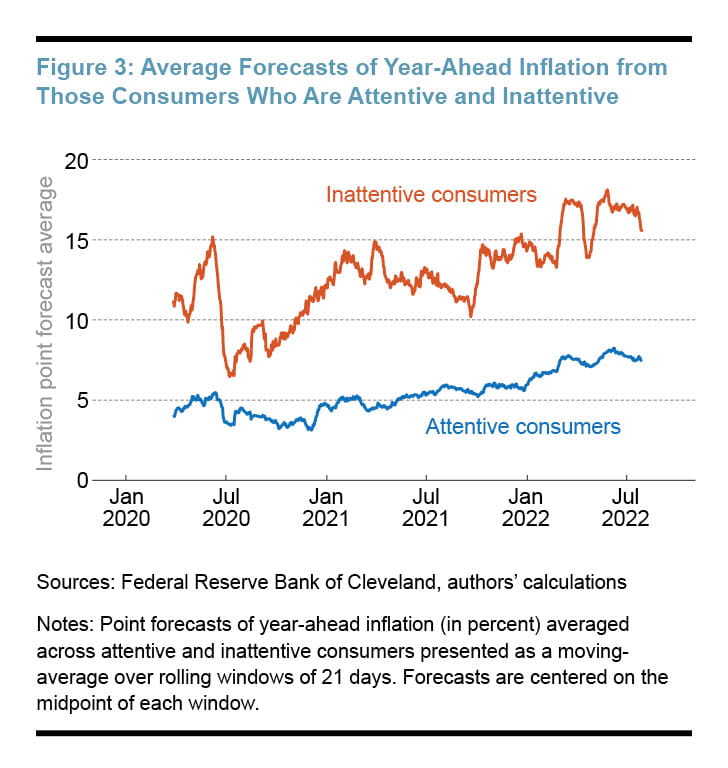 When we separate the forecasts for future inflation given by attentive and inattentive consumers, we see that while the inflation forecasts from both groups have trended up since the onset of the pandemic, the attentive consumers believe that inflationary pressures are considerably less acute than do the inattentive consumers. Understanding the degree of attentiveness and the heterogeneity in attentiveness matters, especially while the Federal Open Market Committee raises the federal funds rate to help reduce inflation and expectations of inflation. Economic theory suggests that more attentive consumers update their inflationary expectations more rapidly in response to changes in policy and the macroeconomic environment. Targeted and highly visible communication strategies might therefore be needed for the Federal Reserve to reach inattentive consumers, who through their behavior still might influence future inflation.