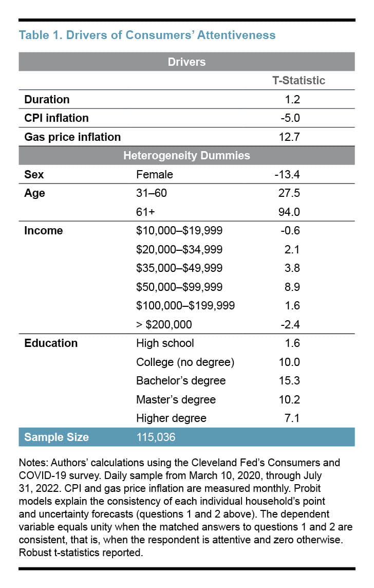 Our proposed measure of attention is based on the consistency between consumers’ answers to two Cleveland Fed survey questions about expectations of inflation. Both questions ask respondents to report their inflationary expectations, but each asks the question in a different way. We define “attentive” respondents as “consistent,” that is, they answer the two inflation questions consistently. We find that attentiveness has risen over the last two years alongside the rise in US inflation to four-decade highs. With consumers more alert to inflation, their expectations should be taken more seriously than ever by policymakers when assessing inflationary pressures in the economy. We would expect inflationary expectations from more attentive consumers to be better informed and therefore to offer more accurate forecasts of future inflation than those from inattentive consumers. Based on our new metric, men, older people, and those with higher education degrees are most attentive.