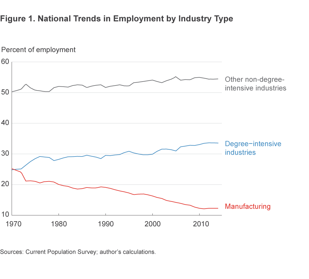 The recent national discussion of income inequality has raised awareness of the millions of Americans who have not been able to achieve upward mobility. For most young people, matching or exceeding their parent’s standard of living requires that they complete high school or college. The environment in which young people grow up and pursue their educations has been radically reshaped by the change in the mix of industries in our economy since 1970. Specifically, the percent of adults employed in manufacturing has been declining while the shares of industries that employ more college graduates have been increasing. This raises the question whether children whose parents do not have college degrees are more or less likely to attain degrees if they grow up in a labor market that has lower shares of manufacturing employment. Likewise, when the children of nondegreed parents grow up surrounded by degree-intensive industries, do those children climb to the next rung of the educational ladder, or are they left behind?