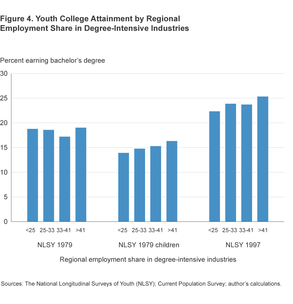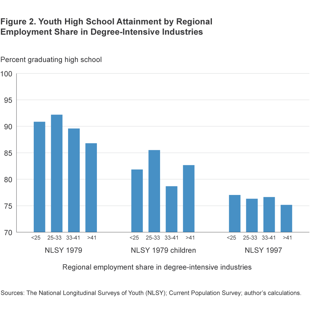 Using the National Longitudinal Surveys of Youth (NLSY), this analysis documents the relationship between industrial composition and the educational attainment of children whose parents have only a high school education or less. The results show that the educational attainment of a region’s youth is correlated with the region’s industrial mix. Contrary to popular belief, students who grow up in regions where manufacturing employs a larger share of the workforce are more likely to finish high school and college than those who grow up in regions without a high manufacturing share. If we compare regions that specialize in college-degree-intensive industries, such as health care, with regions that do not specialize in these industries, we see a pattern that suggests continued inequality. In degree-intensive regions, cohorts of children born to non-college-graduate parents have higher shares of both high school dropouts and college graduates.