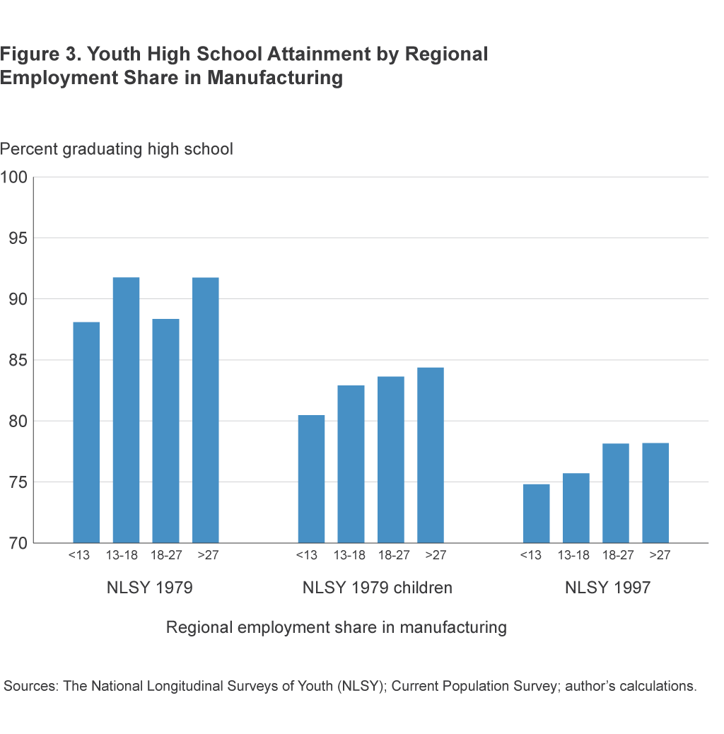 When the survey respondents are sorted by the shares of manufacturing employment that they were exposed to, the patterns are different (figure 3). The 1979 respondents show no negative relationship between manufacturing and high school graduation, but no clearly positive relationship either. For the children’s survey, each higher quartile of manufacturing employment is associated with a higher high school attainment rate, with a 4 percentage point difference from the lowest to highest quartile. The 1997 respondents also appear to have higher high school attainment if they are living in labor markets with higher shares of manufacturing.