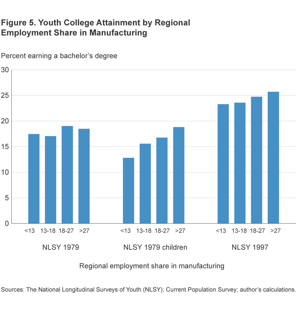 Several things can be taken away from this analysis of the NLSY data. Since the mid-1990s, the children of parents without a college degree are more likely to finish high school and college if they grew up in a labor market with a higher share of its jobs in manufacturing. The positive influence of manufacturing appears stronger for the more recent cohorts, but even during the early 1980s, there is no evidence that nearby manufacturing work discouraged students from finishing school. Growing up near degree-intensive industries is positively associated with the children of parents without undergraduate degrees earning college degrees among the children’s survey and the 1997 respondents. In contrast, growing up near degree-intensive employment is not associated with increased high school attainment for the children of parents without college degrees.