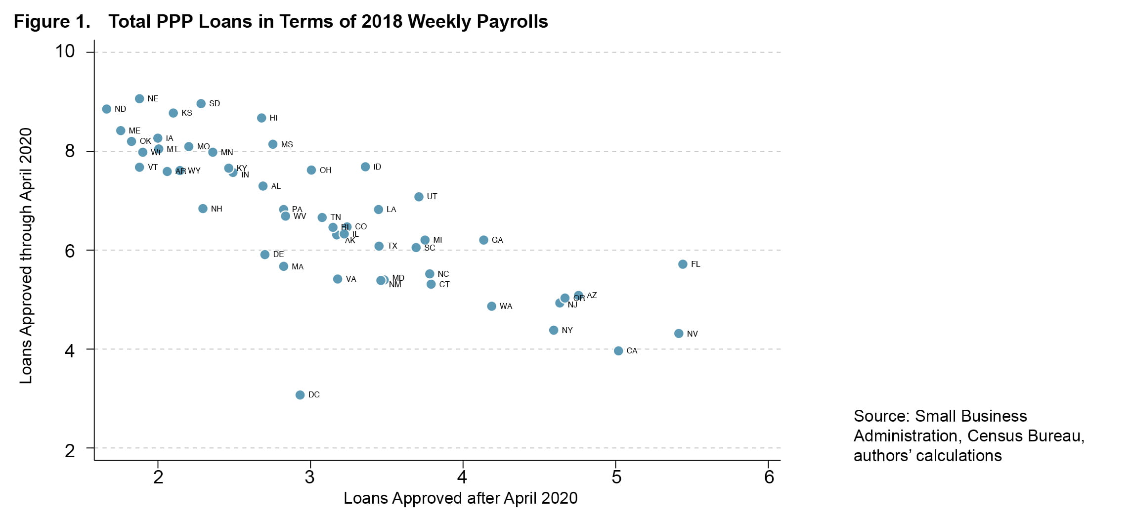 It is, however, hard to interpret the amount of total PPP loans at the state level on its own. Larger states or states with small businesses that on average have higher revenue streams could have applied for and received larger amounts of PPP loans irrespective of how severely they were affected by the pandemic. The level of the PPP loans is particularly uninformative because of the legislative design of the PPP. Since businesses could apply for loans that amount to between 10 and 11 weeks’ worth8 of their average payroll expenses, states with larger populations will appear in our data with larger total loan amounts distributed. By the same token, the small-business sector in two similarly sized states, say, Maryland and Missouri, might incur different payroll costs because of geographical differences in wages and benefits.9 To alleviate this anomaly, we normalize the total PPP loan amount in a state with the total weekly payroll of the small-business sector in that state. For instance, if all the small businesses in a state apply for PPP loans and obtain the maximum eligible amount, the state-level measure of the PPP loan will be slightly more than 10, that is, somewhat greater than 10 weeks of average payroll costs in a reference year. In our case, the reference year will be 2018, which is the year for which we have the most recent data from the Census Bureau’s Statistics of US Businesses (SUSB) to identify a measure of total payrolls for firms with fewer than 500 employees.10