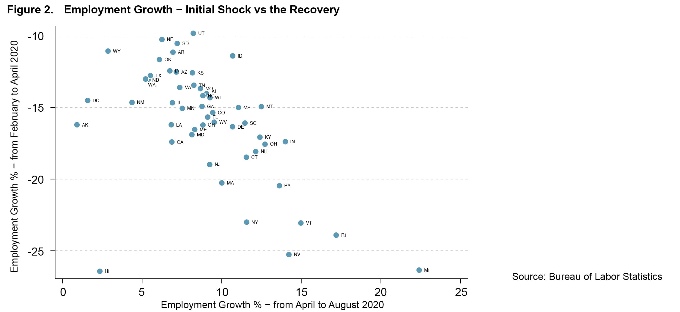 Other covariates such as the fraction of HCI jobs or the size of the small-business sector did not seem to matter much for explaining differences across states in terms of employment recovery during this period of the recovery. In all, our regression framework seems to provide a poor fit for this period. One potential explanation for this is the underlying heterogeneity in terms of mitigation measures and government policy at the state level. Unlike in the first phase up to April 2020, when the entire country was experiencing a lockdown of varying degrees, some states eased their coronavirus restrictions starting in early summer. In this analysis, we did not control for this as we could not find a clear summary measure describing the whole episode (May through August 2020) uniformly for each state.