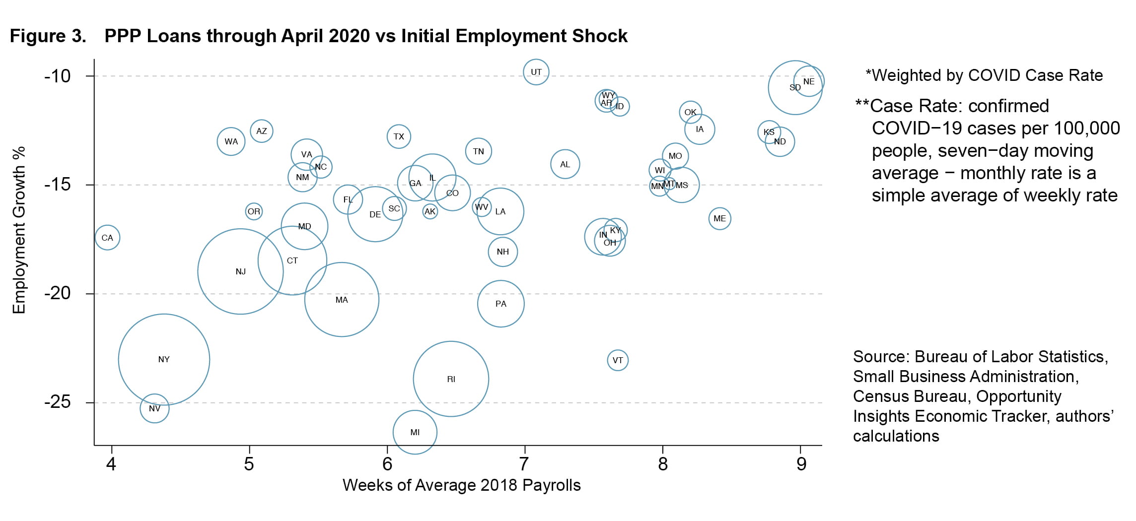 In Figure 3, each state is represented with a circle; the size of the circle reflects the average new case rate per day from February through April 2020.16 We use data on new case rates to control for the severity of the pandemic at the state level. It appears that most of the states with large outbreaks did in fact experience more employment contraction. This is expected as consumers and workers started to avoid their usual economic activities, either voluntarily or because of local government mandates and stay-at-home orders. It is also interesting to note that states that obtained larger PPP loans were not the areas hardest hit by COVID-19 during this first loan dispersal period. We formally test these correlations within a regression framework and control for additional covariates. Column 1 in the table shows that both the total PPP loan amount and the average number of new cases were significant variables correlated with payroll growth from February through April 2020. Our coefficient estimates suggest that one additional week of PPP loans mitigated the decline in employment by almost 1 percentage point (0.93), a number which is statistically significant and economically meaningful.17