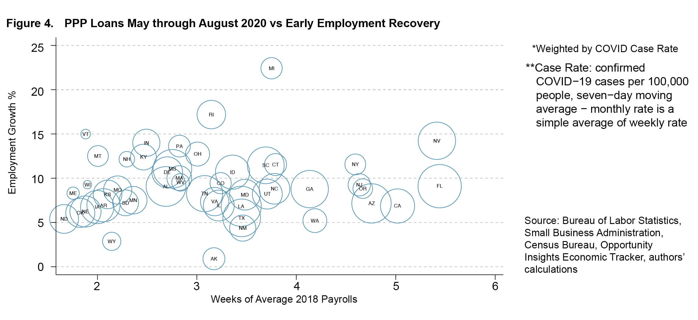 In Figure 4, we visually explore whether employment growth over this early recovery phase was correlated with PPP lending. Even though there seems to be significant variation in terms of PPP loan receipts and employment growth during this episode, the relationship of PPP loans to employment growth appears weaker in this period than in the early months of the pandemic. Column 2 in the table presents our results from the regression for this episode, results which confirm the visual observation and suggest that the correlation is not statistically significant. Thus, higher amounts of PPP loans were not associated with significantly larger employment rebound between April and August. This was a period when outbreaks affected multiple states over the course of the summer, and unlike in the early phase of the pandemic during which caseloads were driven by a handful of states, cases on average stayed relatively high across the country. We can observe this by comparing Figures 3 and 4 and the relative size of the circles for each state. As infections became more widespread geographically, the explanatory power of outbreaks declined during this period (May through August), though they are still statistically somewhat significant.