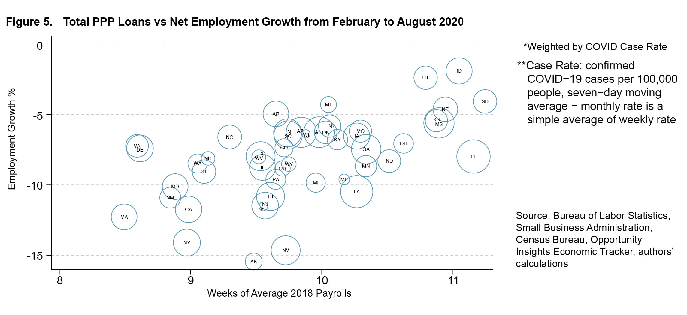 PPP loans and net employment loss from February to August 2020Our study of the recessionary shock and the early recovery period in isolation suggests that, to assess the overall impact of PPP loans from 2020, we need to pay close attention to the early disbursement of loans at the onset of the recession. As small businesses were contemplating what to do in the face of a somewhat novel threat to their survival, having financial support readily available could have mitigated the negative impact of the shock. It is also important to keep in mind that for each individual eligible business, a PPP loan had a maximum feasible limit of 2.5 months of average payroll costs. Thus, in our state-level analysis, there will be a very close relationship between the PPP loans from the two periods (loans received through April versus those obtained from May through August). For instance, Utah received PPP loans that were equivalent to 7 weeks of payrolls by the end of April 2020, a disbursement amount which meant that about 3 to 4 weeks of additional support could have been available for the reminder of the program. Indeed, as Figure 4 shows, Utah received an additional 3.7 weeks’ worth of PPP loans from May to August. Since total loan amounts across the two periods should be close to 10 weeks of the aggregate payroll, PPP loan amounts at the state level for the first period should predict the later amount obtained because of the limitations on the number of weeks of payroll costs available (see Figure 1).