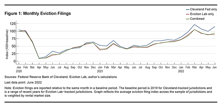 While incidental reporting on eviction filings in local courts reached the press in the early days of the pandemic, there was no large-scale system in place to conduct real-time surveillance of evictions. In July 2020, the Federal Reserve Bank of Cleveland examined weekly trends from 44 cities and counties across the nation, showing steep declines in eviction filings from prepandemic levels (Cowin et al., 2020). Updates to the Bank’s eviction filing series currently cover 50 cities and counties (Martin, 2022). Princeton’s Eviction Lab also launched a systematic effort to measure eviction filings during the pandemic (Hepburn et al., 2020).3 To examine these trends, I construct jurisdiction-level indexes of the number of filings in the current month divided by the number of filings in a base period reflecting historical averages. For jurisdictions monitored by the Cleveland Fed, the base period is the same month in 2019. For those monitored by the Eviction Lab, it is the same month in one or more recent years between 2012 and 2019 that vary depending on the jurisdiction. An index close to 100 indicates that eviction filings are happening at the same rate as they did in the year or years leading up to the pandemic.