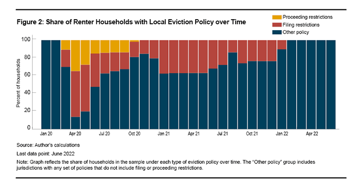 In the sample of cities and counties in this analysis, local eviction restrictions were most common in April 2020, when 86 percent of renter households in these markets faced a restriction on either proceedings or on filings. This proportion gradually decreased as the pandemic continued, as seen in Figure 2. The last recorded filing restriction in the sample expired in January 2022.