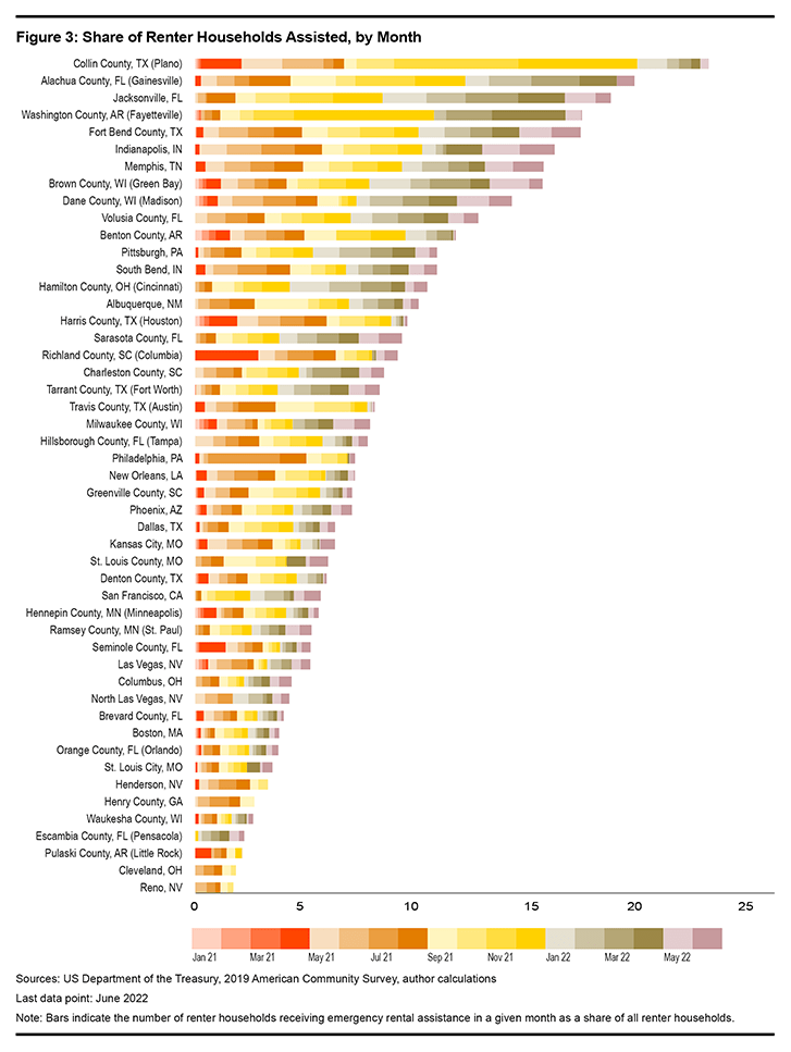 Figure 3 shows the share of renter households receiving ERA assistance over time for the markets in this analysis that receive their own allocations of ERA funds. There is variation both in the timing and intensity of aid, with some places reaching a larger share of renter households or reaching households sooner than others.